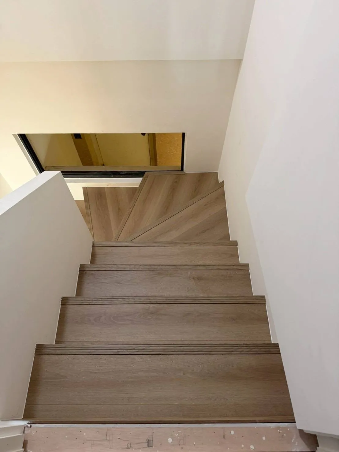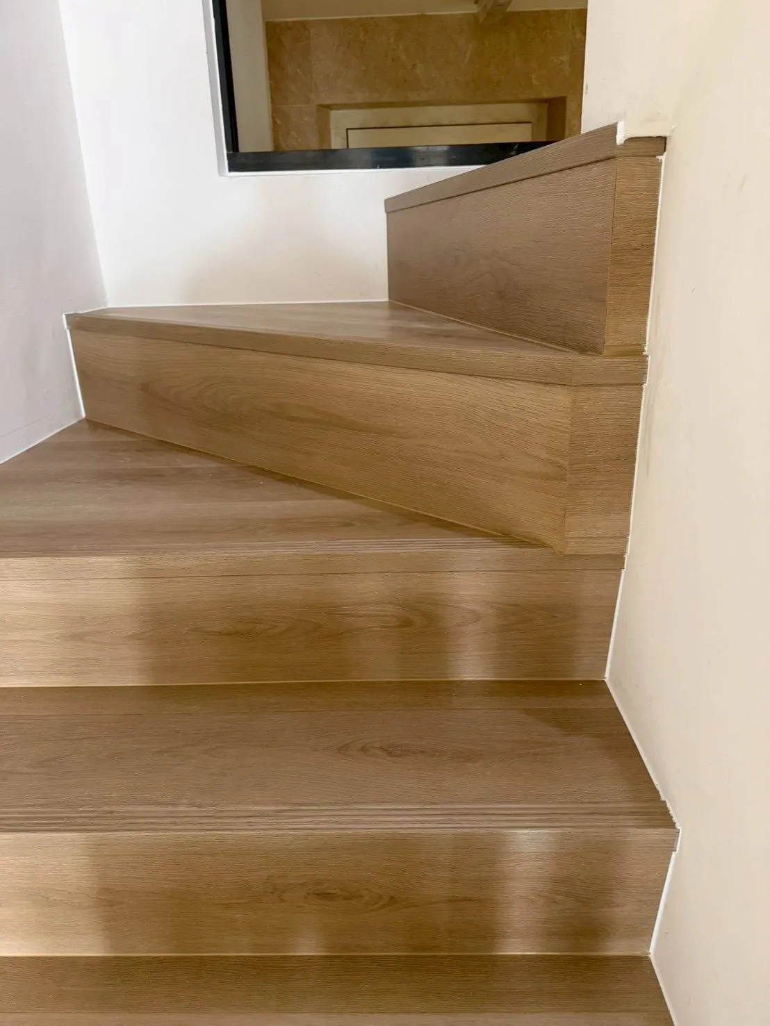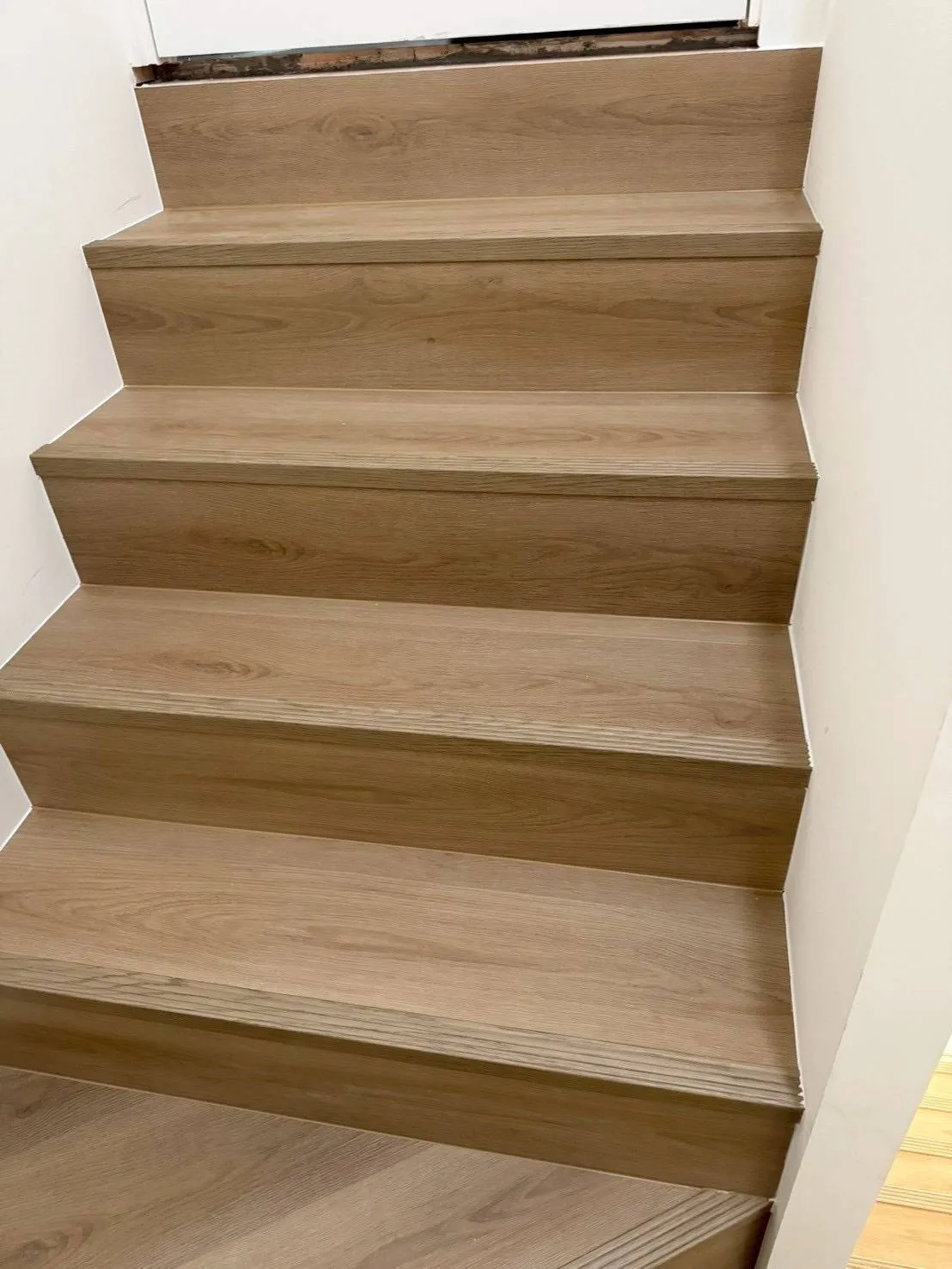 樓梯地板施工最考驗師傅的細節處理。我們在每一階踏板邊緣安裝了專用的樓梯止滑壓條,不僅止滑,更清楚界定階梯邊緣。側邊與牆面接縫處則採用相近色矽利康收邊,讓整體呈現和諧、俐落的美感。